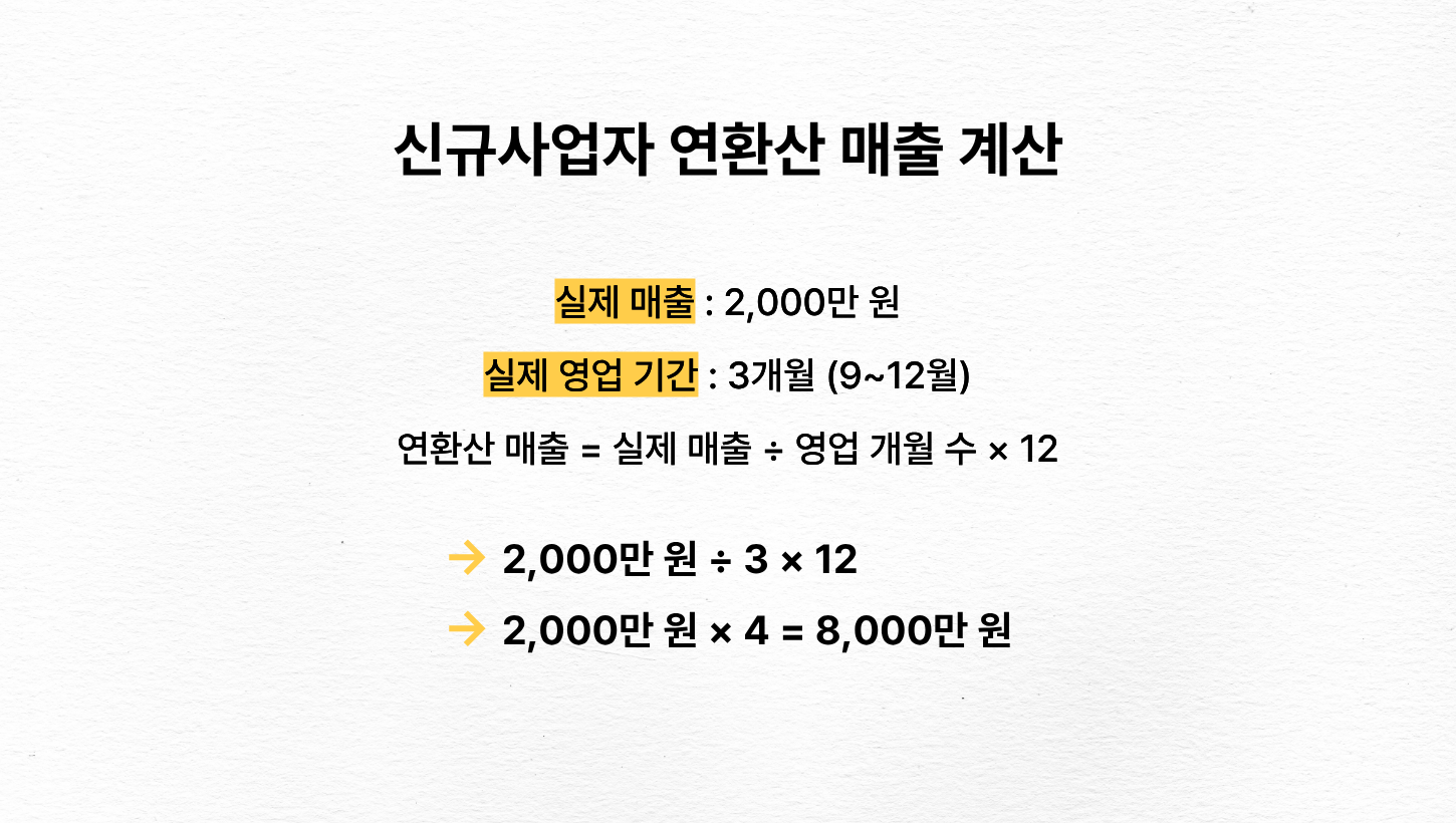 또한, 신규사업자의 경우에는 12개월로 환산한 금액으로 계산하는데요. 예를 들어, 2025년 9월에 개업하여 3개월만 장사했다면, 9월부터 현재까지 매출 x 4를 해서 그 금액을 기준으로 판단해요.