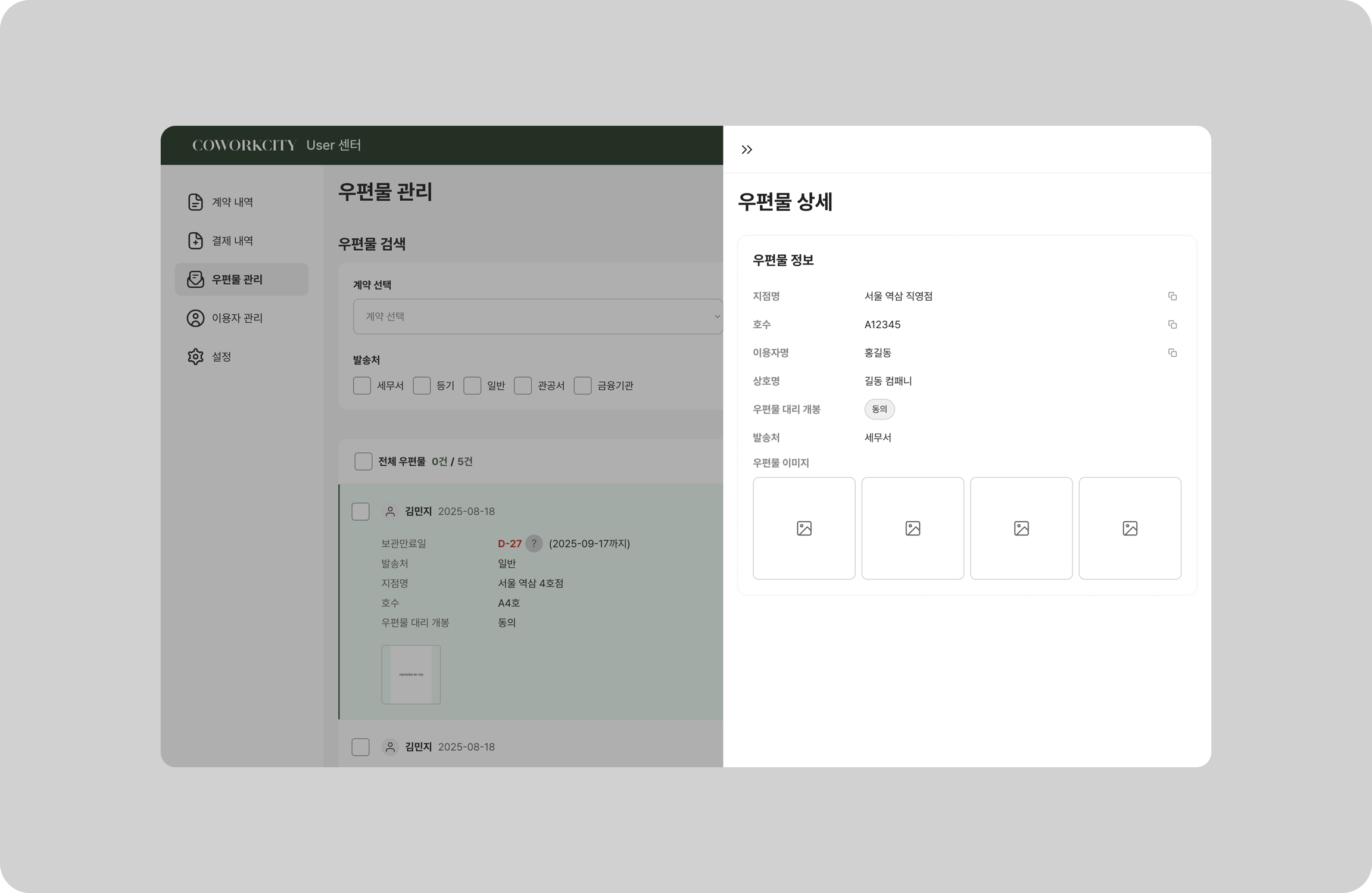 상세 정보도 클릭 한 번으로 우편물 관리 메뉴에서 각 항목을 클릭하면 우편물의 자세한 정보를 바로 확인할 수 있습니다. 발신자, 도착 일자, 우편물 종류 등을 한눈에 파악할 수 있어 업무 효율이 한층 높아집니다.